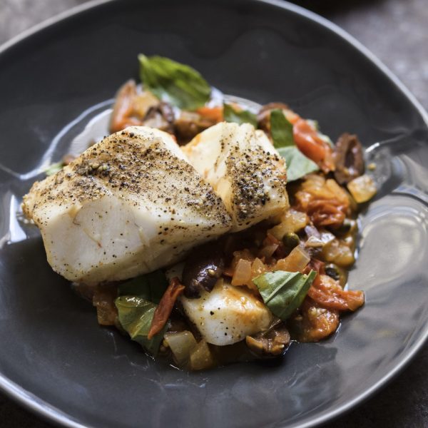 There are many versions of pesce all’acqua pazza, or “fish in crazy water,” but all involve poaching or simmering fish in a tomato broth or sauce. For our version, anchovies, black olives and capers bring bold, punchy flavor to mild-flavored fillets.